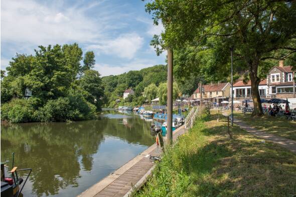 Bath’s trademark Georgian houses line the canal, and the top lock has sweeping views over the city. The original locks 8 & 9 were merged to create Bath Deep Lock, one of the deepest on the entire canal network, and the canal finally joins the river Avon at Bath Bottom Lock (no.7). This beautiful city offers much to explore with its Royal Crescents, Jane Austen, Roman soldiers, Palladian mansions and Regency houses, and of course chic shopping and places to eat. From Bath to BristolContinuing from Bath towards Bristol, your route now follows the river that you’ve shadowed so far on your journey. The Avon snakes its way through the outskirts of Bath then out into mainly open countryside punctuated by large river locks with distinctive weirs alongside. After you reach Hanham Lock, lock 1 of the Kennet & Avon Canal, the tidal river Avon swirls its way into Bristol before the feeder canal beyond Netham Lock makes a straight beeline towards the heart of the city and the Floating Harbour. |